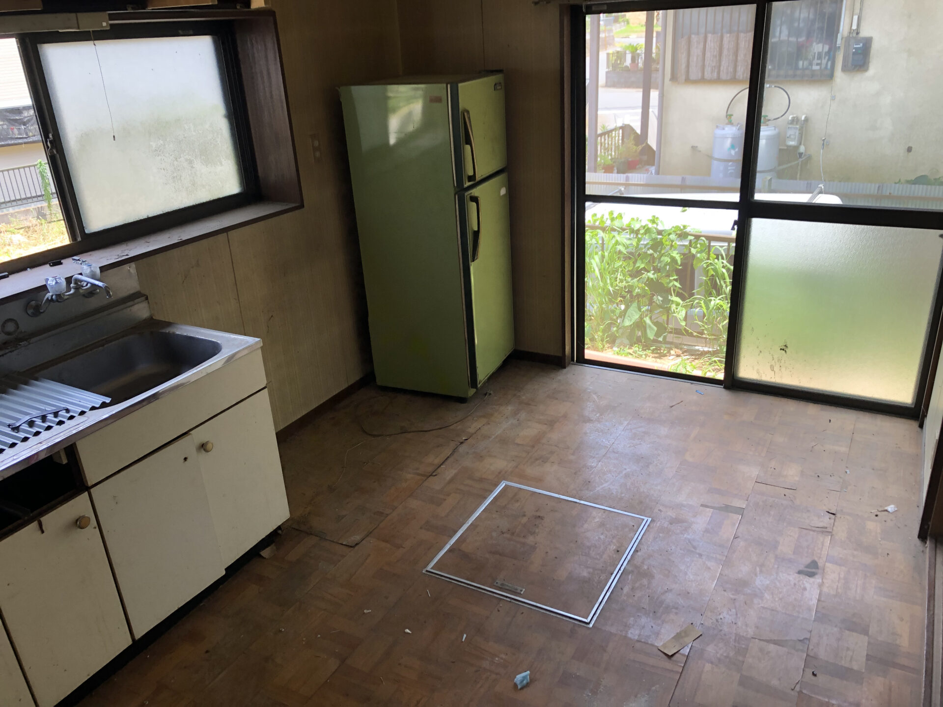 水道管の劣化による水漏れと床の劣化が激しく、歩くと床が抜けそうな状況でした。